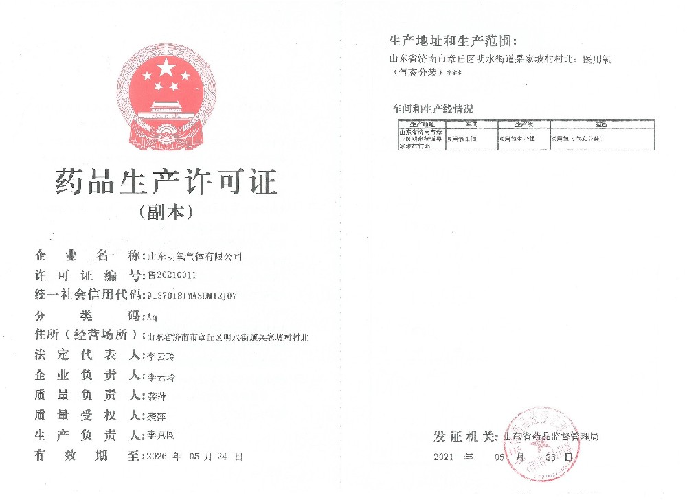 2022年12月取得國家藥品監督管理局頒的藥品注冊證書,醫用氧項目正式投入生產